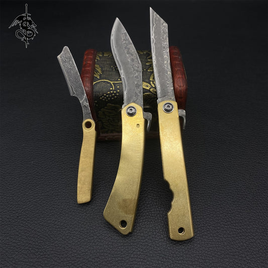 Damascus Steel Razor Knife Brass Handle Folding Knife 3 In 1 Pack