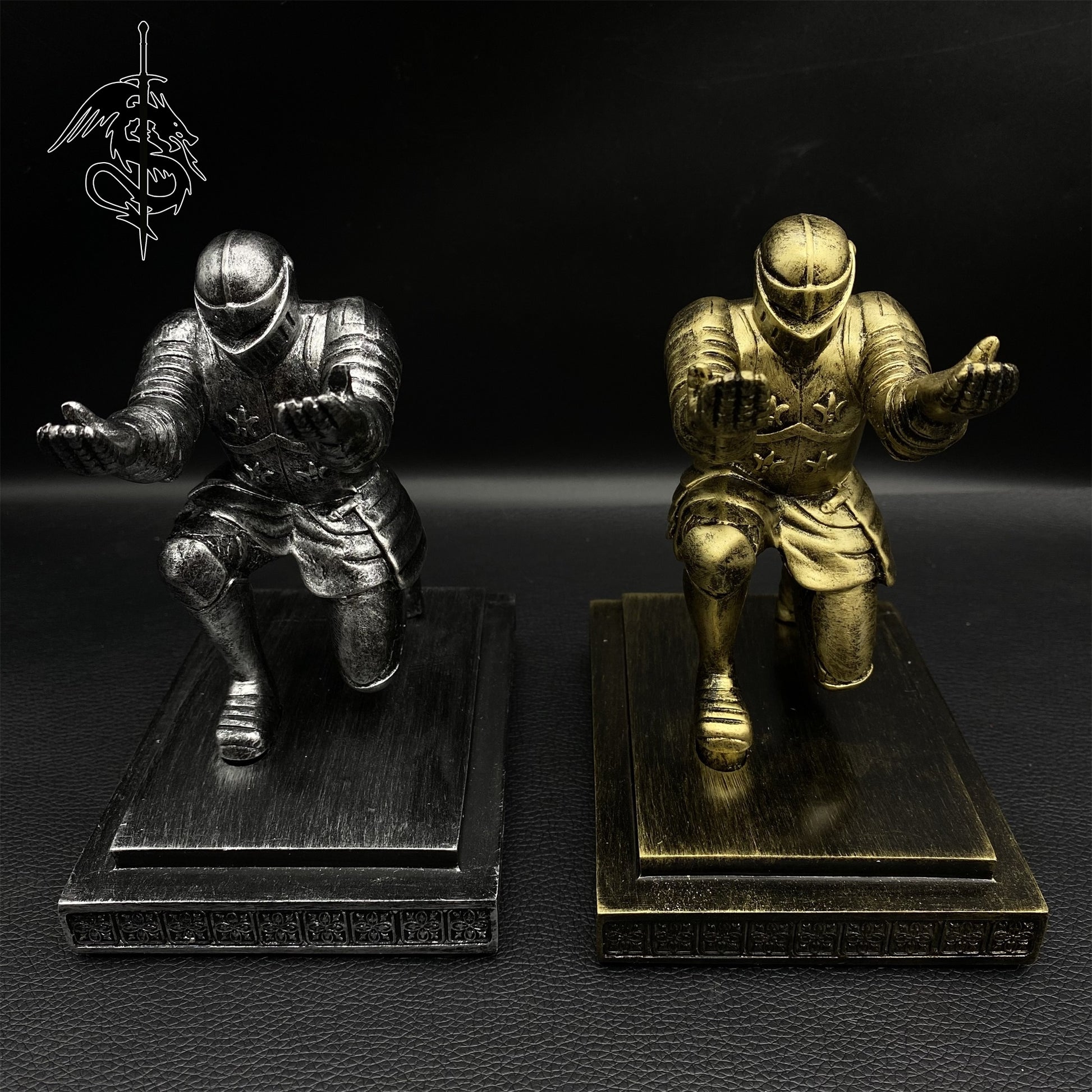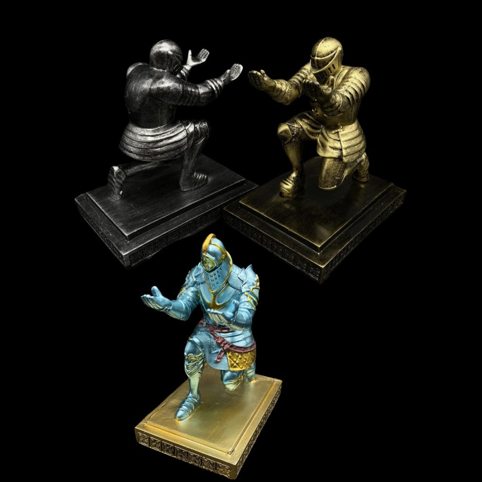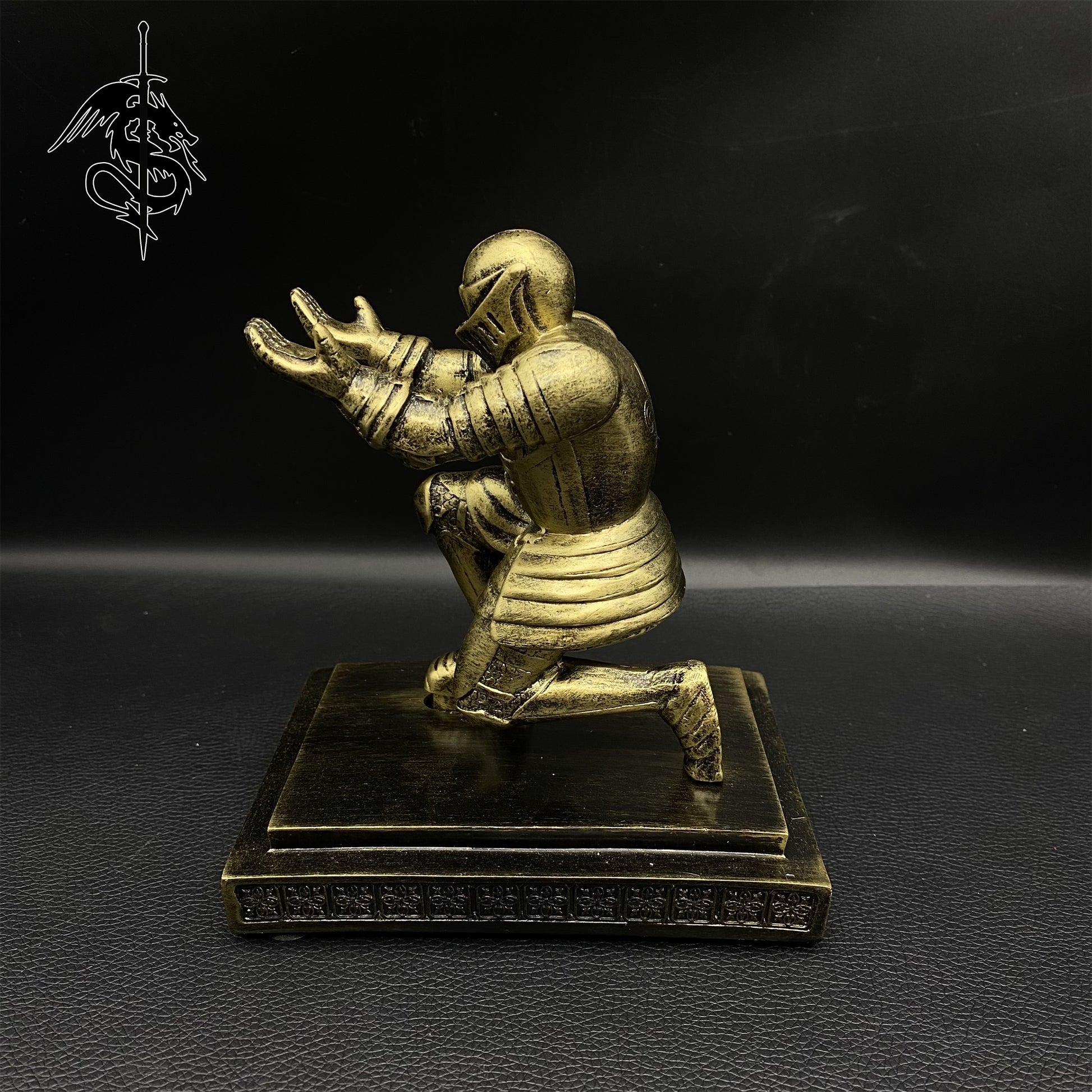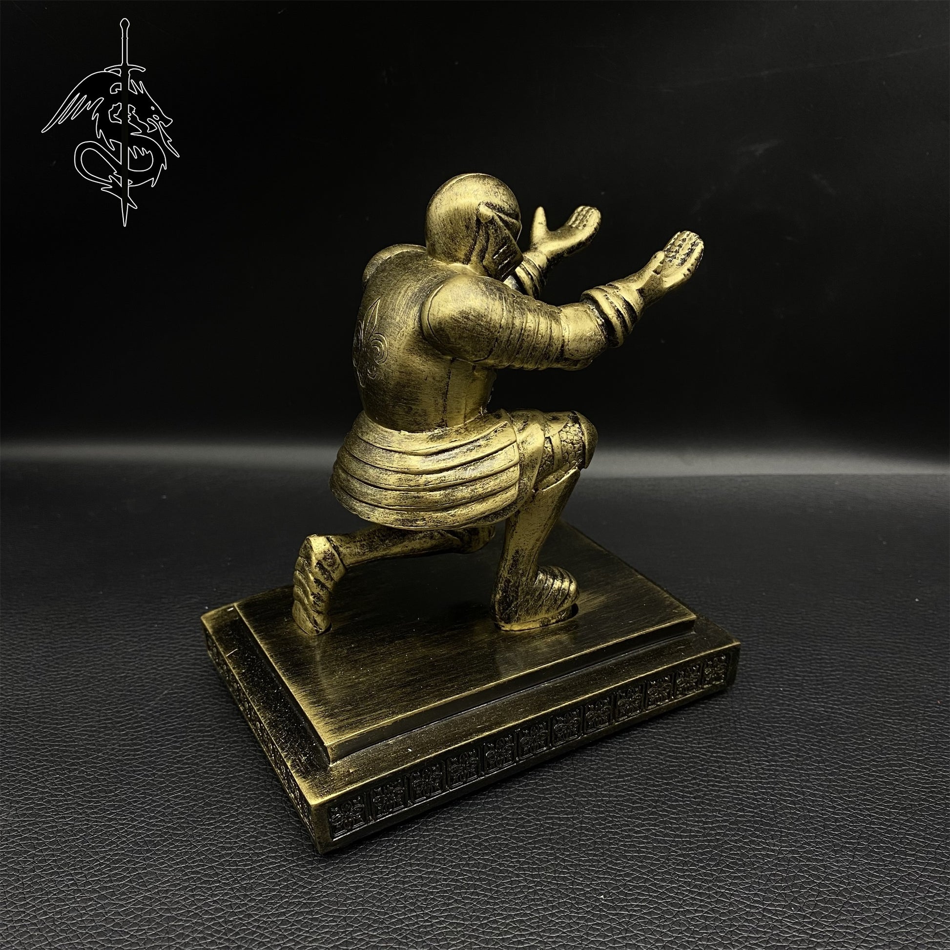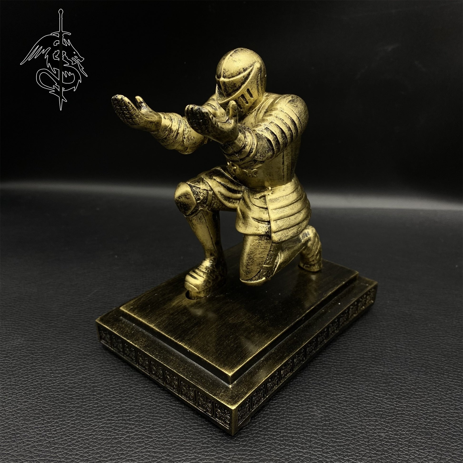 This kneeling knight figure is specifically made for display middle age weapon miniature, luxury pen, or something like this.
